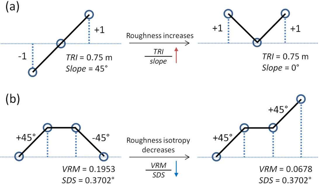 Idealized terrain configurations demonstrating how morphometric parameters vary relative to each other for (a) TRI and slope, and (b) VRM and SDS. (a) A smooth surface sloped at 45° (left) and a rough, flat surface represented as a notch with 45° sloped surfaces facing toward each other (right). (b) A bump with 45° sloped surfaces on either side facing away from each other (left) and a step with 45° sloped surfaces on either side facing in the same direction (right).