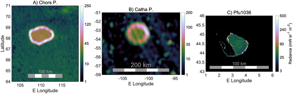 Three examples of lava lakes with clear evidence of an outer hot ring and a colder, yet emitting, inner crust. (A) Chors Patera in orbit 55. (B) Catha Patera in orbit 62. (C) Pfu1036 in orbit 57. Colors are coded according to M-band radiances, with all units in mW Sr−1 m−2. Adapted from A. Mura et al. (2025a) and F. Tosi et al. (2025).