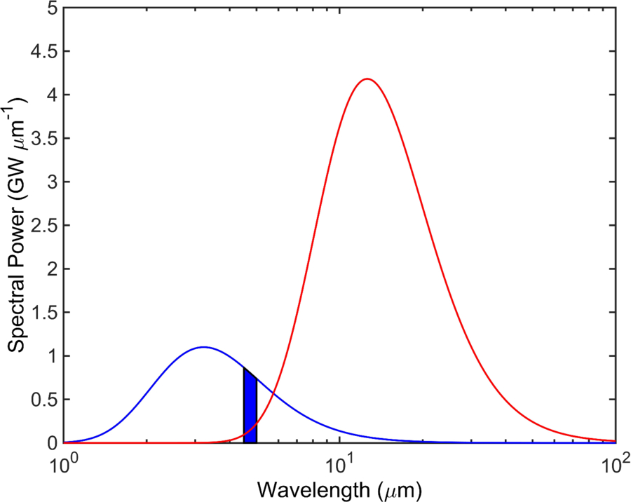 In blue, the spectral power (spectral radiance integrated over solid angle and area) coming from the hotter ring of P63 (at 900 K); in red, the spectral power coming from the colder but much larger crust (at 230 K). The area for the crust is ∼500 km2 (as described in the main text); the area for the hotter ring is inferred from the measured M-band power, as in A. Mura et al. (2024a) and F. Tosi et al. (2025). The blue area represents the integrated signal captured in the M band of JIRAM (or any other instrument working in the 4.5–5 μm range). Adapted from F. Tosi et al. (2025) for the case of P63.