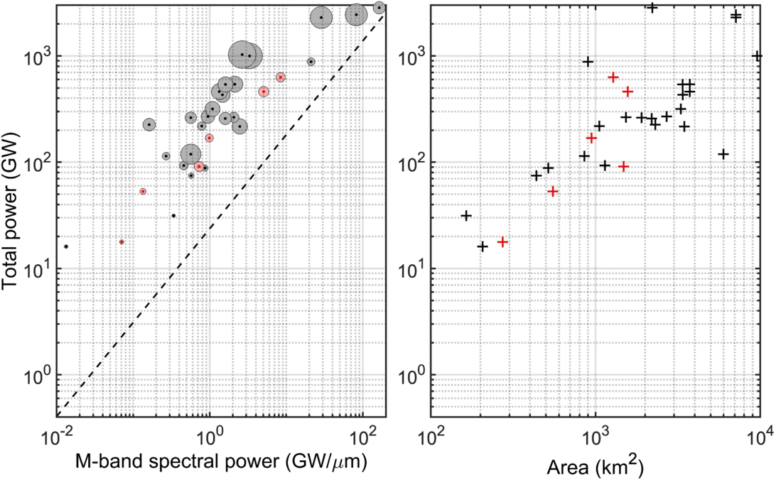 Left: gray circles represent the spectral power in the M-band (centered at approximately 4.78 μm and with 0.5 μm of bandwidth) in GW/μm on the x-axis, plotted against the total power in GW on the y-axis. For comparison, the dashed line indicates the empirical relationship employed by Davies & Veeder (2023) and J. E. Perry et al. (2025): y = 23.702x0.8838, where y is the total thermal emission in GW and x is the 4.8 μm spectral power in GW/μm. Circles are sized according to the area of the patera/lake. Red circles/dots are cases where the estimation is less reliable (see the discussion and Table 2 for details). Right: same, plotting the total power in GW on the y-axis as a function of the area of the patera/lake on the x-axis.