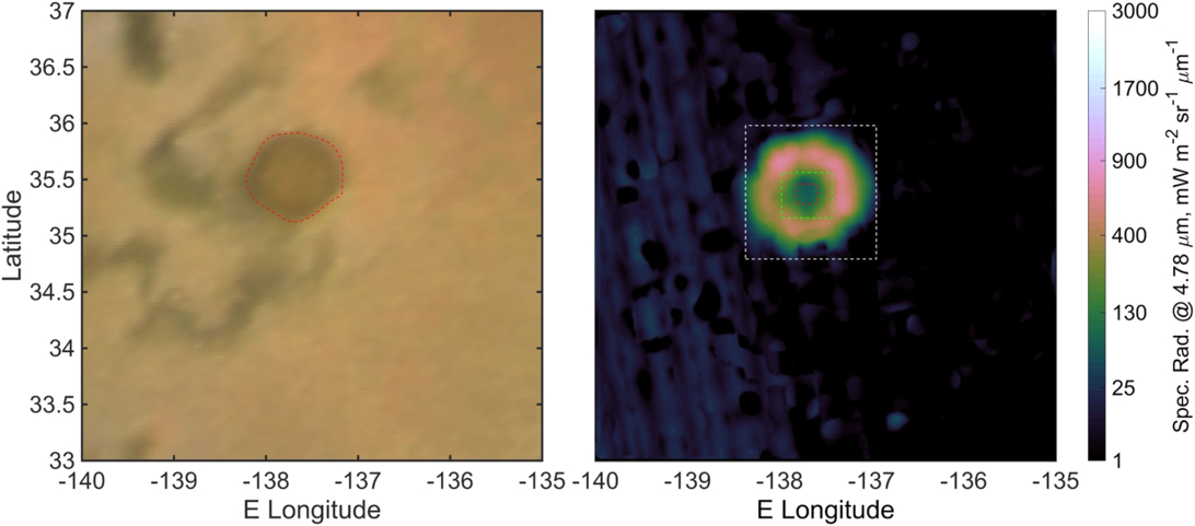 P63 in the visible (left) and infrared (M band, right), similar to Figure 2 but with a different color scale to improve readability. We now overimpose the colored boxes introduced in the text. On the left, the red dashed curve shows a typical reconstruction of the patera size from the visible image, used to estimate the area when USGS data are unavailable. On the right, three boxes of different sizes are used for the crust radiance estimation algorithm: The large white box encloses the entire patera and is used to estimate the total M-band radiance. The medium green box encloses most of the crust but may include a small contribution from the ring. The small red box contains only crust. See the main text for details.