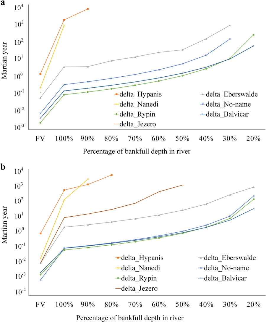Continuous time span range required for delta formation under various water levels in the inlet channel. The time span is depicted in two logarithmic scale graphs: (a) maximum continuous time span and (b) minimum continuous time span. Shown in the the fully filled valley (“FV”) scenario, meaning that the water completely fills the entire valley during a full-flood scenario.