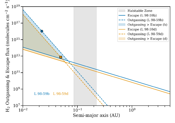 Orbital dependence of hydrogen (H2) outgassing and atmospheric escape for planets L 98-59b (blue) and L 98-59d (orange). Solid lines represent energy-limited escape rates, while dashed lines show estimated H2 outgassing rates driven by tidal heating for Earth-like outgassing conditions (moles H2 kg−1 magma). Shaded regions highlight the “outgassing zones” (OZs)—orbital ranges where volcanic H2 outgassing exceed atmospheric escape, enabling the potential buildup of a secondary H2-dominated atmosphere. The gray vertical band marks the conservative habitable zone (HZ) based on the R. K. Kopparapu et al. (2013) criteria. Points indicate the present-day semimajor axes of L 98-59b (circle) and d (square), showing that both planets reside inside their respective outgassing zones. The inner limit of the outgassing zone is not shown in the figure, as it lies interior to 0.01 au.
