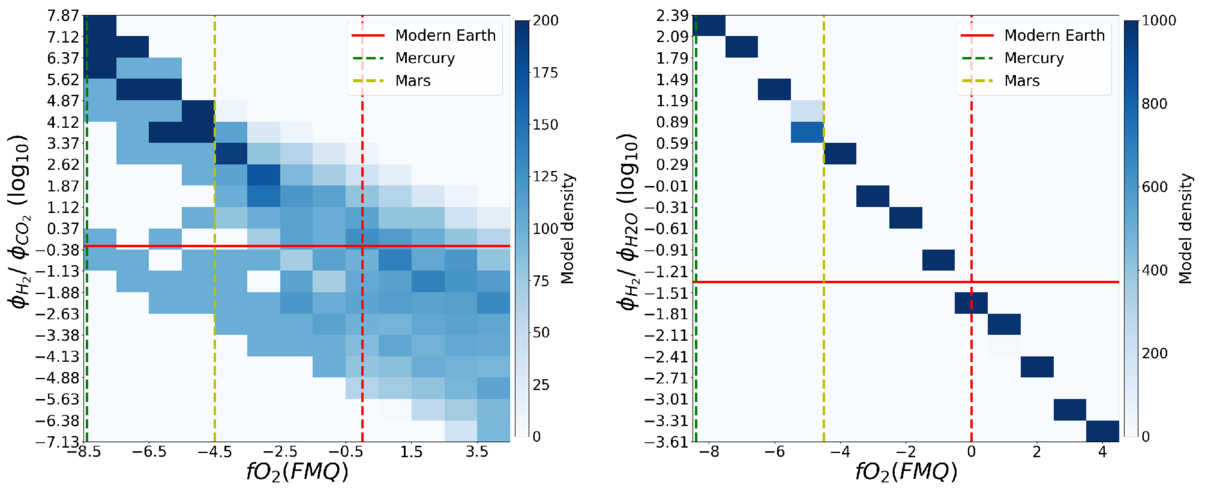 Number of models meeting given ﹩\frac{{{\rm{H}}}_{2}}{{{\rm{CO}}}_{2}}﹩ outgassing flux ratio as a function of fO2 at a surface temperature of 1573 K. All other parameters (Table 3) are marginalized over. The red horizontal line shows modern Earth ﹩\frac{{{\rm{H}}}_{2}}{{{\rm{CO}}}_{2}}﹩ outgassing flux ratio for context. Bulk redox states of Mercury (M. Y. Zolotov et al. 2013), Earth (D. C. Catling & J. F. Kasting 2017), and Mars (A. E. Doyle et al. 2020) are marked by dashed lines. Solid red lines present Earth outgassing ratios (R. Hu et al. 2023).