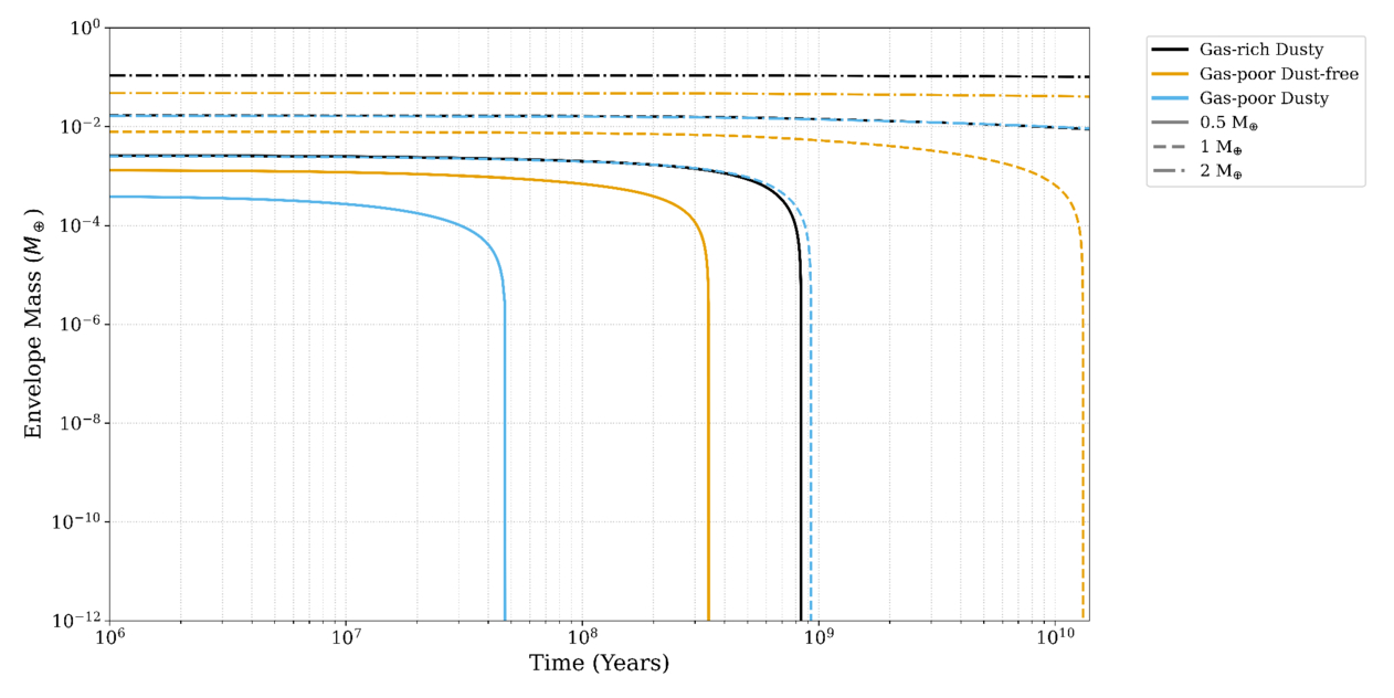 Time evolution of atmospheric mass for hypothetical rocky planets with core masses of 0.5 M⊕, 1 M⊕, and 2 M⊕ (solid, dashed, and dashed–dotted lines, respectively), orbiting at 0.1 au and radius calculated using mass–radius relation of Earth-like rocky planets (L. Zeng et al. 2019). Curves represent the evolution of atmospheric mass under energy-limited atmospheric escape under evolving stellar XUV flux. Initial atmosphere masses are derived from different disk scenarios: gas-rich dusty (black), gas-poor dusty (blue), and gas-poor dust-free (orange).