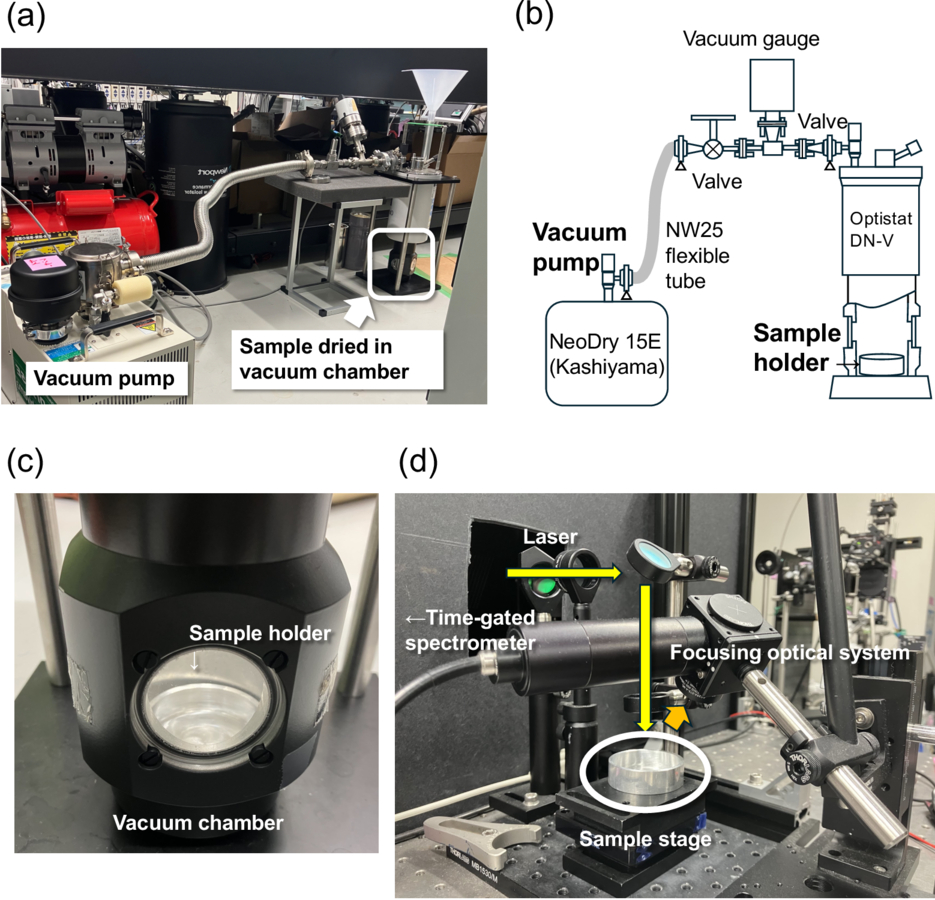 Cooling experimental apparatus. (a) Photograph and (b) schematic diagram of the dry freezing system. (c) The sample chamber with a sample (i.e., a frozen solution) in the chamber. Above this is a cooler filled with liquid nitrogen. (d) Photograph of the Raman spectrometer.