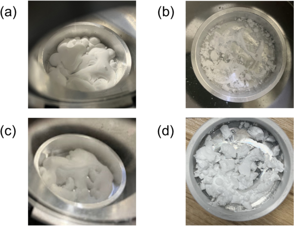 Photographs of the samples at (a) pH = 9 immediately after starting vacuum pumping and (b) pH = 9 after 18 hr of vacuum pumping; and (c) pH = 11 immediately after starting vacuum pumping and (d) pH = 11 after 18 hr of vacuum pumping. The sample holder is 5 cm in diameter.