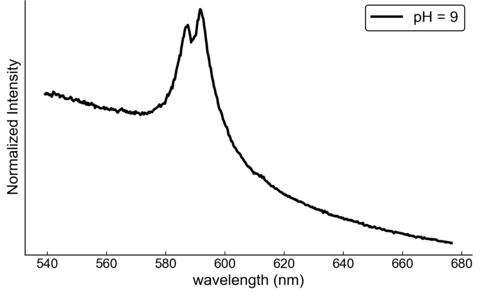 Example of an LIBS spectrum showing Na atomic emission lines, obtained for a sample from the pH 9 solution. The spectrum was acquired using the same instrumental setup as that used in this study (accumulation count = 100, grating = 150 lines mm−1, exposure time = 10 ns), but with a smaller laser spot diameter (∼2 mm).