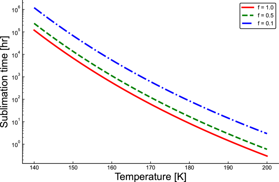 Sublimation time as a function of temperature for different coating suppression factors (f = 1.0, 0.5, and 0.1). Salt coatings substantially increase the survival time of ice under Enceladus-like conditions.