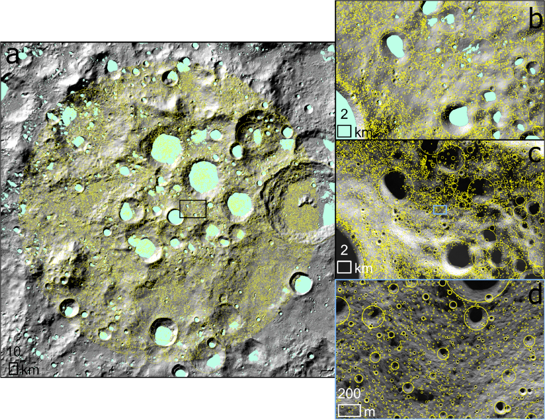 Craters detected at different scales across the lunar south polar region (combined YOLOv8 + LOLA + Robbins + manual catalog, with the vast majority of detections from YOLOv8). The combined catalog has ∼21 million detected craters D ≥ 10 m (actually ∼40 million total, though very incomplete when D < 10 m). (a) 1:4M view of the south pole showing craters (yellow) from the catalog (D ≥ 200 m subset) and LOLA-defined PSRs (cyan). The black box is the extent of subparts (b)/(c). The base map is a LOLA hillshade. (b) Example 1:500K regional view of a portion of the detected craters (D ≥ 30 m subset) superposed on a LOLA hillshade with LOLA PSRs. Note that PSRs are in craters at multiple scales. (c) Same region on the LROC-controlled average mosaic. The blue box is the extent of subpart (d). (d) 1:40K local view of a portion of the catalog to demonstrate detection of decameter-scale craters.
