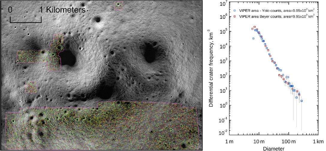 Crater counting in an outlined portion of the candidate VIPER traverse area (pink). To compare this study to manual counts by coauthor Beyer, we filter both counts to sizes 6–250 m. Craters in green were detected by both approaches, yellow were detected by this study only, and craters in red were detected by Beyer only. As is normal in crater comparisons (e.g., S. J. Robbins et al. 2014), a number of true positives detected by one method were missed by the other. However, the differential SFD determined for the count area using both methods overlaps closely between 15 and 250 m (especially between 15 and 50 m), suggesting strong agreement between counting methods. Plot made using CraterStats (G. G. Michael 2013).