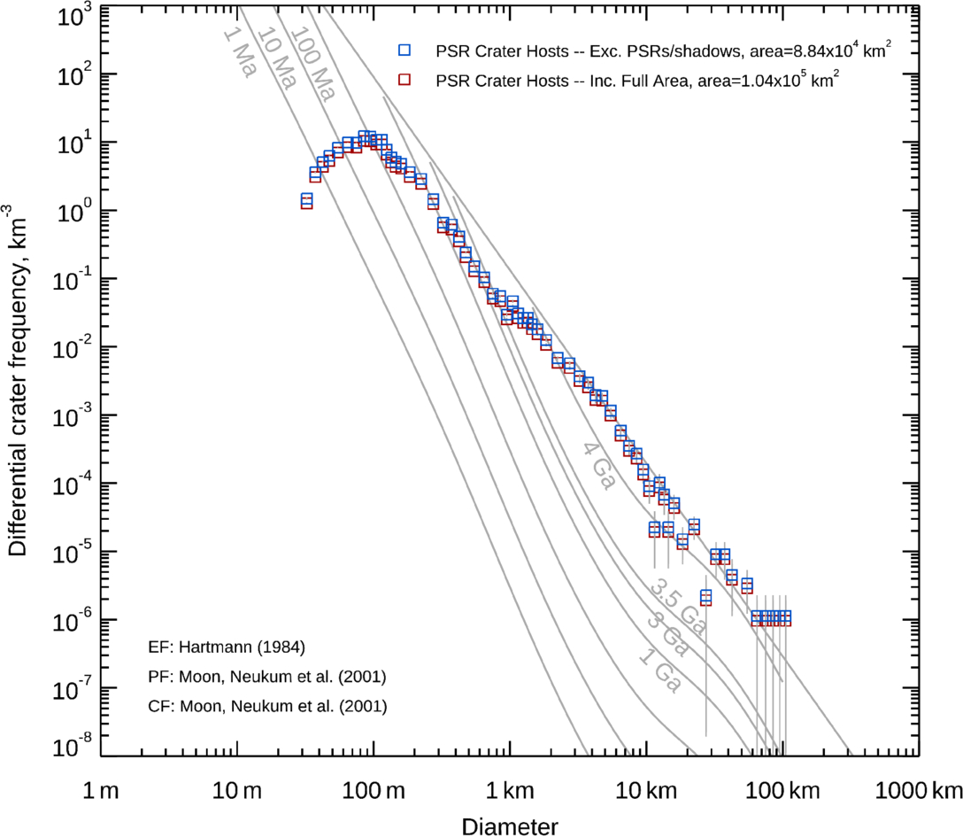 A differential SFD of craters that host PSRs (binned in ﹩\sqrt[4]{2}﹩ bins from 32 m to 131 km). On this differential plot, where the PSR-hosting craters’ SFD crosses isochrons is a proxy for how long craters at that size typically host PSRs. The two overlapping series on this plot come from how counts were converted to frequency. The red series is based on assuming that the effective count area is the full area south of 84°S (equivalent to assuming that any new crater will host a PSR; a good assumption for large craters). The blue series is the frequency based on an area excluding PSR area (because small new craters that form inside existing PSRs will not themselves host a PSR but instead fall inside one), also excluding areas not illuminated on the LROC-controlled mosaic. The uncertainty in frequency this fuzziness in area induces is a ∼15% effect. The rollover in PSR-hosting craters at sizes smaller than 80 m is likely set by the minimum size of PSRs resolved in the LOLA PSR catalog (see Figure 5). Plot made using CraterStats (G. G. Michael 2013).