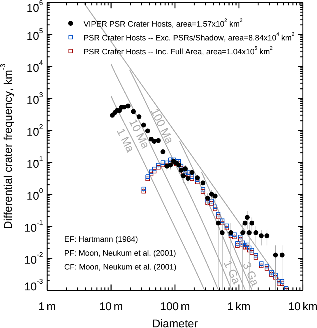 A differential SFD of PSRs within the VIPER landing areas based on SfS topography, along with the background population across the pole. On this differential plot, where the PSR-hosting craters’ SFD crosses isochrons is a proxy for how long craters at that size typically host PSRs. The continued upward slope of craters found to host PSRs from D ∼ 20 to 80 m contrasts with the pole-wide analysis, suggesting that the PSR-hosting lifetime declines more steadily than would be inferred from the pole-wide analysis alone. The most likely cause of this is incomplete detection of decameter-scale PSRs with LOLA data alone. For this reason, we use the VIPER region as a guide to the lifetimes of craters D < 100 m. Plotted with CraterStats (G. G. Michael 2013).