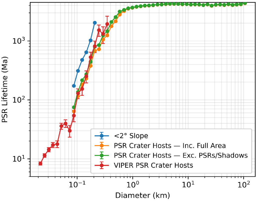 Typical lifetimes of PSRs hosted by craters as a function of crater diameter, computed by calculating the intersection of measured PSR host crater frequencies with Neukum isochrons and the data from Figures 4 and 5. We truncate the VIPER data >350 m where count statistics are poor and exclude diameters <80 m in the pole-wide (non-VIPER) data because of the observed rollover at small sizes, which is likely an observation artifact. For craters smaller than 600 m diameter, lifetimes for PSRs inside craters decline rapidly. The lifetime of D ∼ 200–300 m PSRs is typically of order 1 Gyr (longest on the shallowest slopes); at D ∼ 100 m, PSRs typically last 100 Myr.
