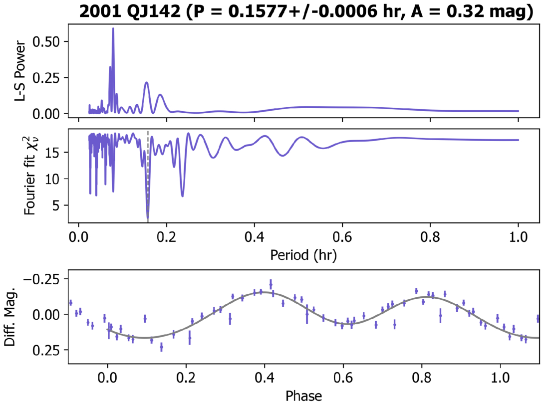 The upper panel is a Lomb–Scargle (LS) periodogram, the middle panel is the χ2 statistic associated with Fourier series fits to the data as a function of rotation period, and the lower panel shows the photometric data points phase folded to the best-fit period, which is indicated in the title of each subplot and by the vertical gray dashed line in the middle panel.
