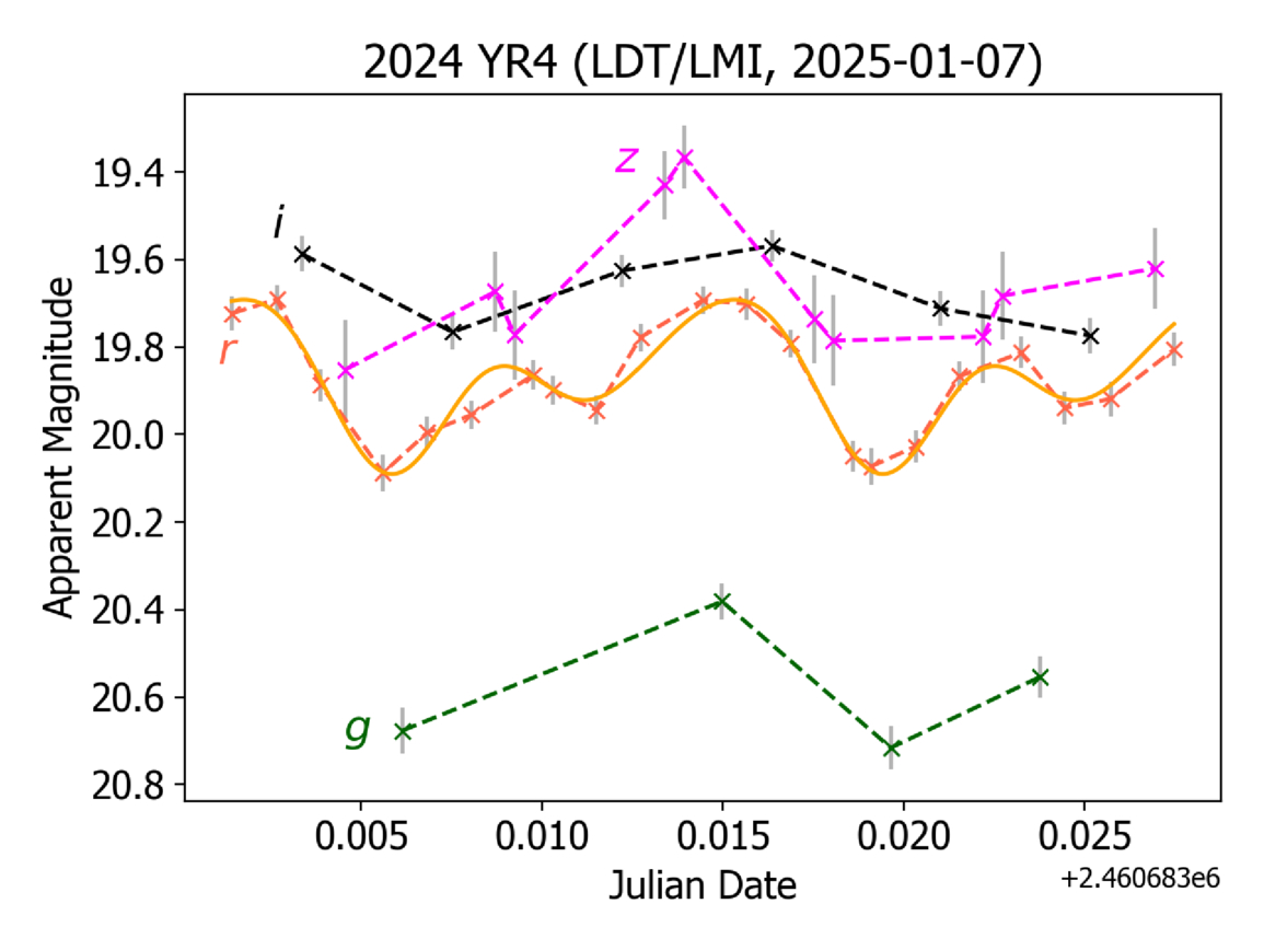 Time-series griz photometry for 2024 YR4 obtained from the LDT on 2025 January 7. Sets of exposures in the individual filters are color coded and annotated. The r-band data were obtained to track lightcurve variations over the 30 minutes color sequence. Fitting just those data with a third-order Fourier series (orange line) produced a reasonable period solution (P ∼ 0.33 hr) and amplitude (0.4 mag) consistent with other studies of this object (B. T. Bolin et al. 2025). This fitted lightcurve was used to compute the r magnitude at specific times throughout the imaging sequence so that g − r, r − i, and r − z colors could be retrieved.