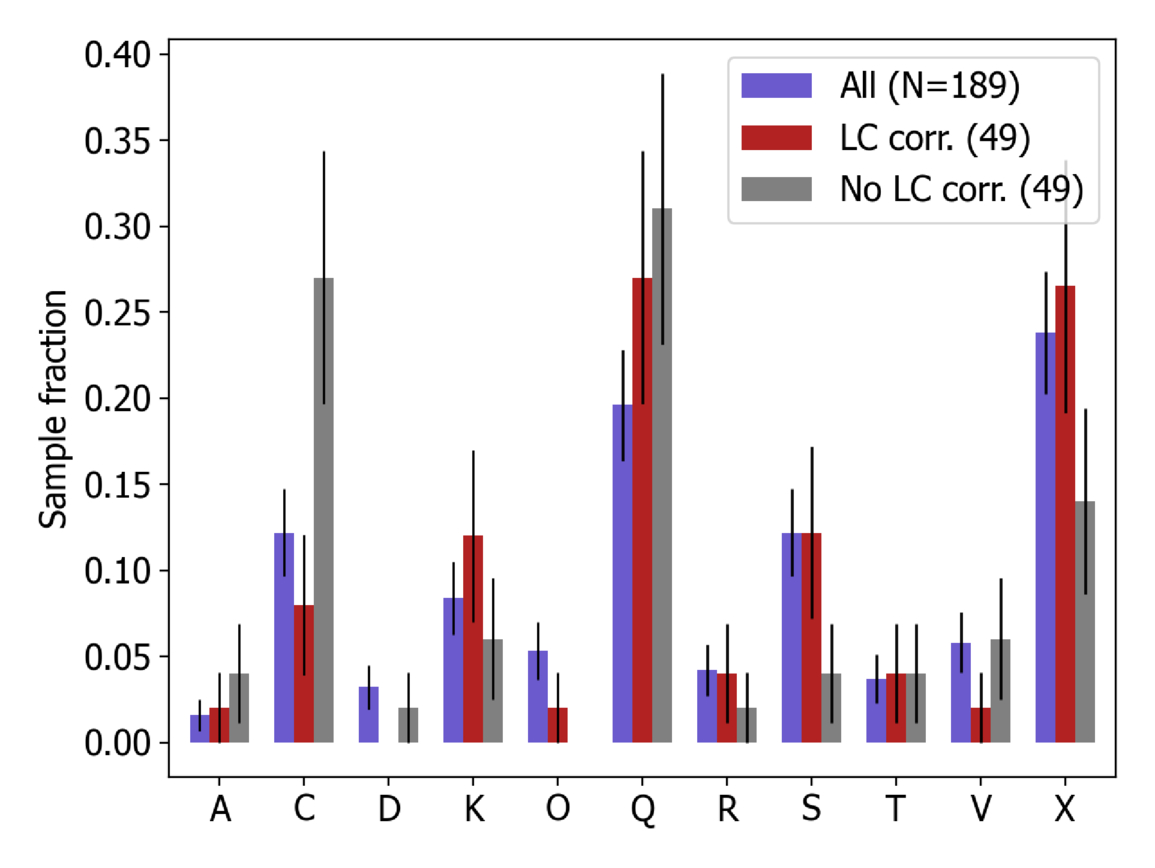 Taxonomic type distributions for the full color sample (blue), the 49 objects with measured lightcurves that were used for rotational corrections (red), and those same 49 objects without proper lightcurve (LC) correction (gray). The full sample and the LC corrected sample are highly consistent within the ﹩\sqrt{N}﹩ Poison errors on each bin. The non-LC corrected sample shows significant differences; most prominent is a marked overabundance of C types.