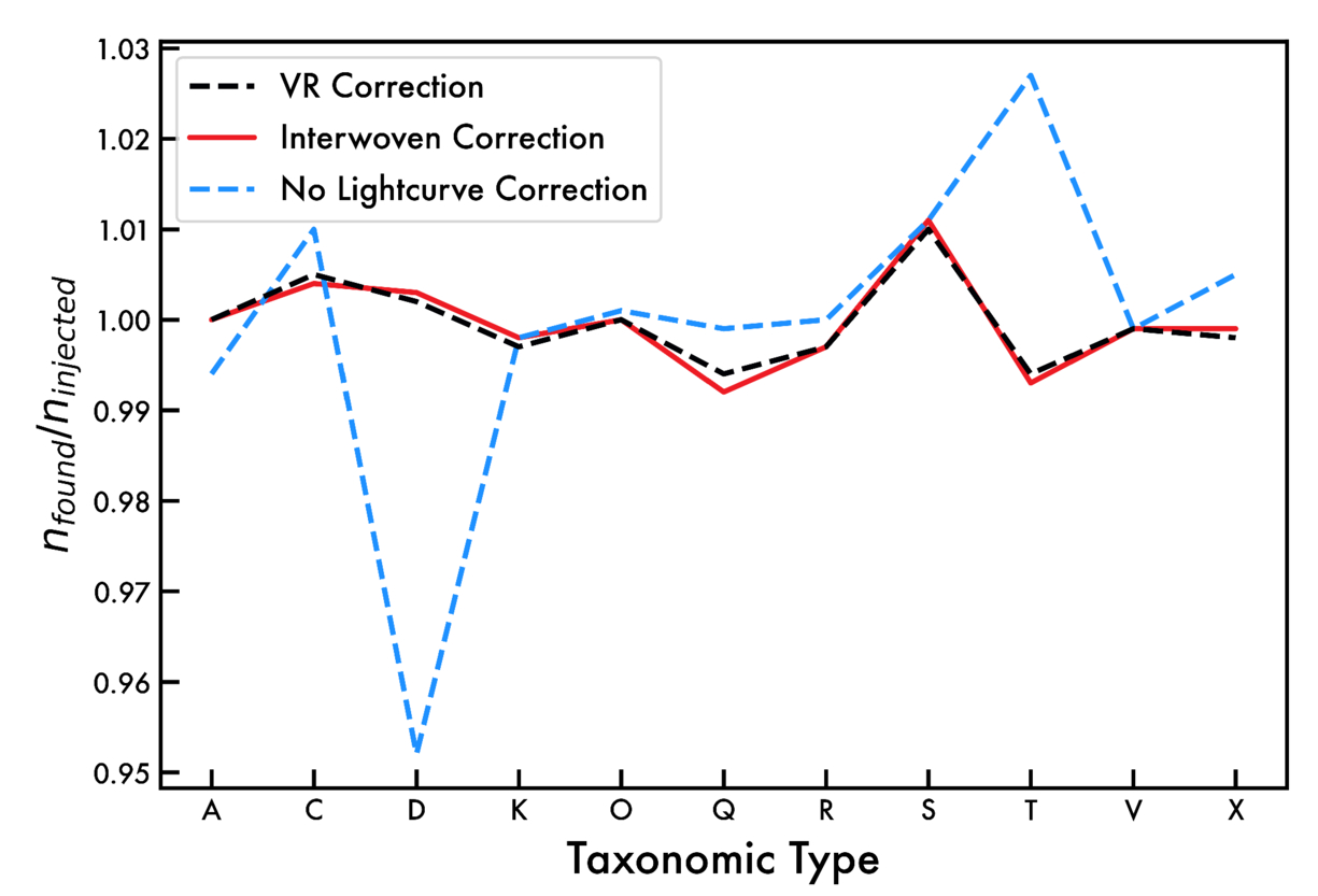 Model output in which synthetic multifilter asteroid observations are converted to taxonomic types with lightcurve correction based on a dedicated VR-band lightcurve sequence (black), on a polynomial fit to an interwoven reference filter during the color sequence (red), and without any correction (blue). If lightcurves did not influence taxonomic assignment, the number of returned objects in each type (nfound) would equal to the number injected (ninjected). Lightcurve correction clearly moves the derived taxonomic distribution closer to the true (injected) population. See the text for more details.