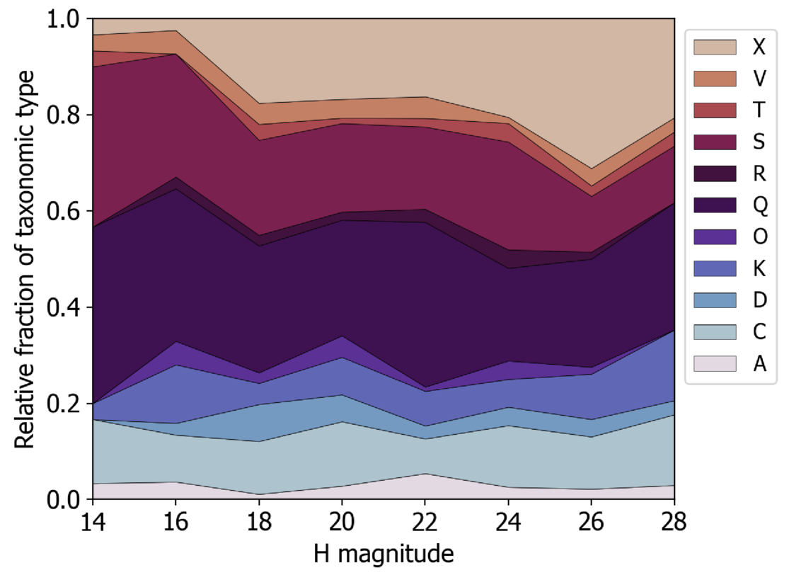The relative fraction of each taxonomic type as a function of absolute magnitude H derived from a combination of visible-wavelength results from MANOS, NEOSHIELD2, and MITHNEOS. A prominent feature in this figure is the decrease in S and Q types with increasing H, which is compensated for by an increase in X types.