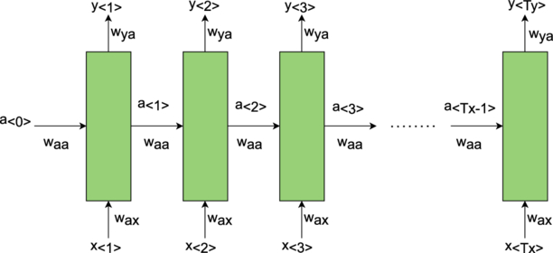 Standard RNN architecture used for sequence-to-label classification. The recurrent connections propagate information through time, and only the terminal output ﹩{y}_{\langle {T}_{y}\rangle }﹩ is used for prediction.