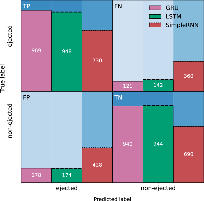 Confusion-matrix-structured comparison of classification outcomes for the GRU, LSTM, and SimpleRNN models. Each quadrant corresponds to a confusion-matrix cell (true positive, false negative, false positive, true negative), with color-coded bars showing the results for each model; bar heights are normalized within each true-class row, while the numbers denote absolute counts.