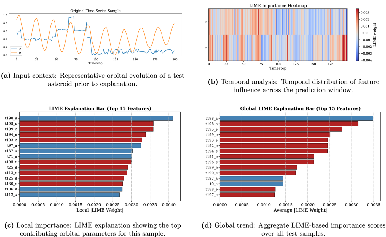 LIME explanation results for the best-performing GRU model. Panels (a)–(d) illustrate the original time-series, temporal feature influence, local feature contributions, and global feature trends, respectively.