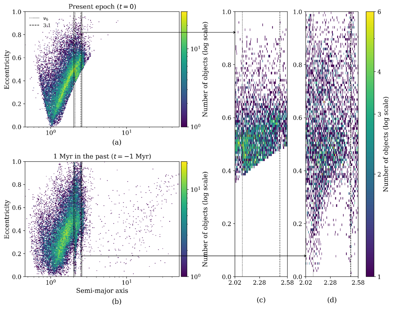 Evolution of the orbital-element distribution for the nonejected NEA sample. Panel (a) shows the present epoch (t = 0) semimajor axis–eccentricity (a–e) density distribution, and panel (b) shows the backward-integrated epoch (t = −1 Myr) for the same sample. Colors indicate logarithmic number density. Vertical dashed lines (annotated in the panels) mark the nominal locations of the ν6 secular resonance and the 3:1 mean-motion resonance with Jupiter. Panels (c) and (d) show zoomed-in views of the corresponding regions highlighted in panels (a) and (b), respectively.