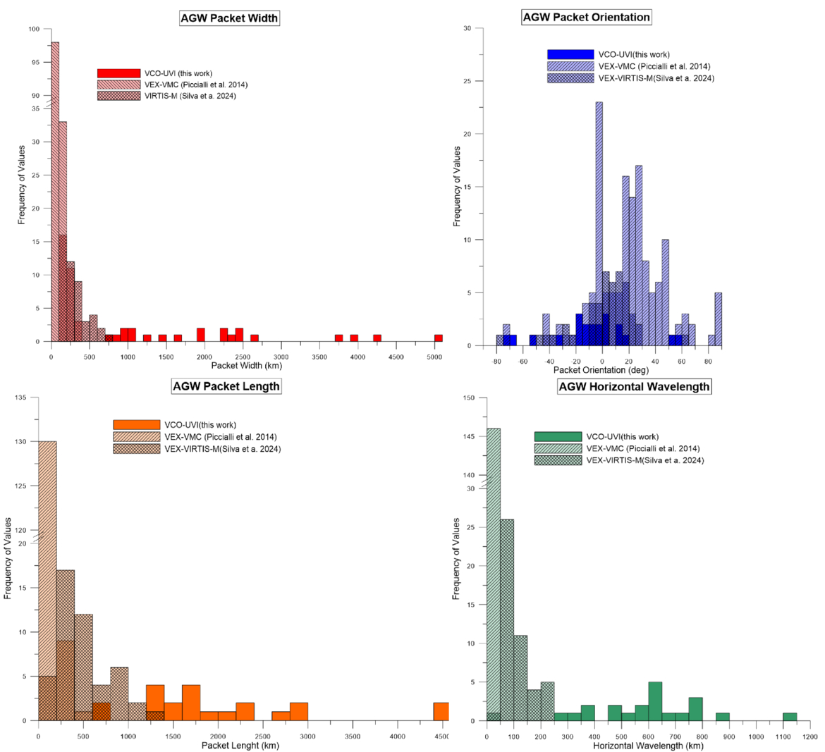 Histogram plots of the morphological properties of identified waves on the dayside Akatsuki/UVI image. Also included are the results from A. Piccialli et al. (2014) and J. E. Silva et al. (2024).