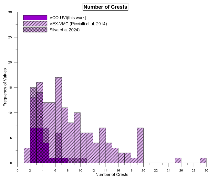 Histogram showing the number of crests on each characterized wave packet. Also included are the results from A. Piccialli et al. (2014) and J. E. Silva et al. (2024).