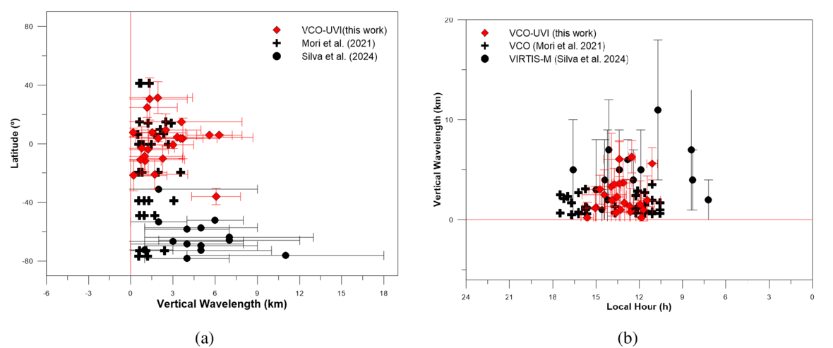 Vertical wavelength results plotted against (a) latitude and (b) local time. Red diamonds represent the results of this work’s Akatsuki/UVI waves, black circles represent the results of J. E. Silva et al. (2024), and black plus signs represent the results for R. Mori et al. (2021).