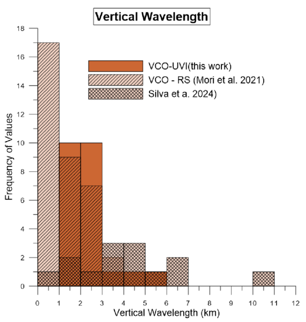 Histogram showing the vertical wavelengths of characterized wave packets. Also included are the results form J. E. Silva et al. (2024) and R. Mori et al. (2021).
