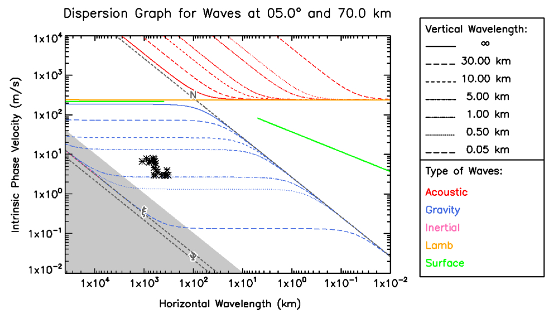 Dispersion diagram for dynamically characterized waves with Akatsuki/UVI. Each dashed colored line represents the value of the vertical wavelength that a wave would have given its specific horizontal wavelength and intrinsic phase velocity values according to the models described in J. Peralta et al. (2014).