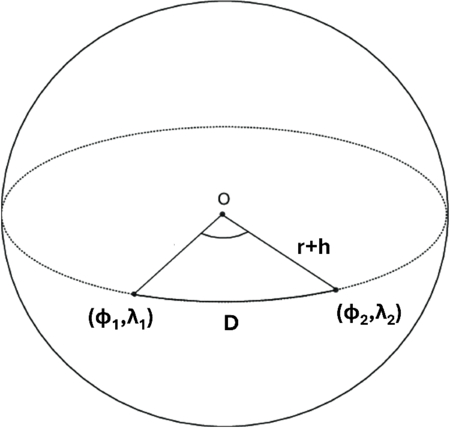 Representation of the distance D between two points on a cloud layer of altitude h on a planet of radius r. O represents the center of the planet, λ is the longitude coordinate, and ϕ is the latitude coordinate of each of the points represented.