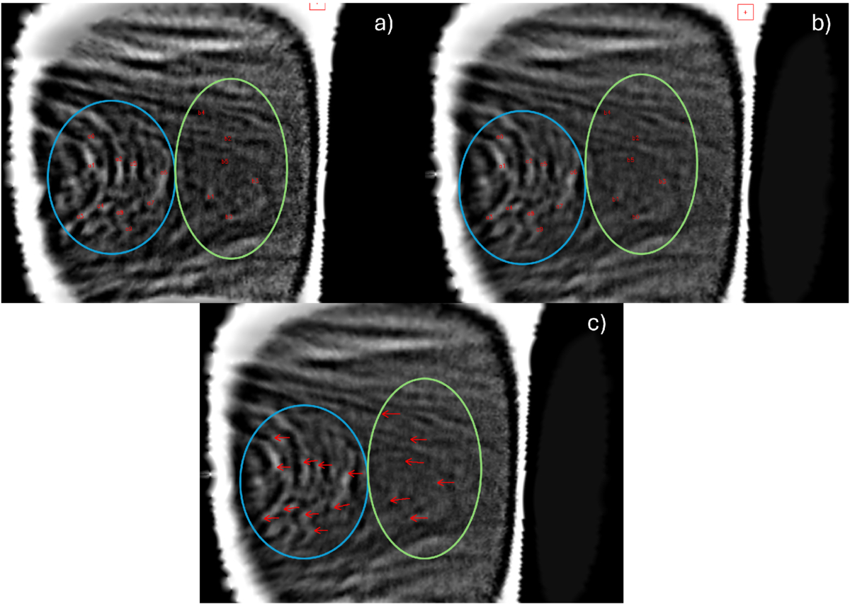 Example of tracer analysis applied to a pair of consecutive images from orbit r0095. Panels (a) and (b) show the distribution of individual tracers, and panel (c) illustrates the corresponding motion vectors indicated by red arrows drawn on the same image as panel (b). The tracers and vectors inside the blue ellipse represent the wave phase speed, while those inside the green ellipse represent the background wind speed.
