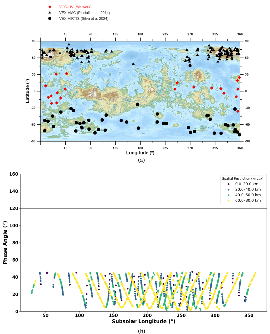 (a) Distribution of characterized wave packets on the dayside of Venus during the period of observation vs. latitude and longitude. Red diamonds represent this work’s Akatsuki/UVI wave packets, black triangles represent the A. Piccialli et al. (2014) wave packets, and black circles represent the J. E. Silva et al. (2024) wave packets. (b) Phase angle of all Akatsuki/UVI images acquired with the 365 nm filter that satisfy the condition ∣LonSS − LonSSC∣ < 45°, where LonSS is the subsolar longitude and LonSSC is the subspacecraft (subobserver) longitude. Each circle corresponds to one image, and the horizontal line at 120° indicates the same cutoff limit used in Figure 1. Colors denote the spatial resolution of each image.