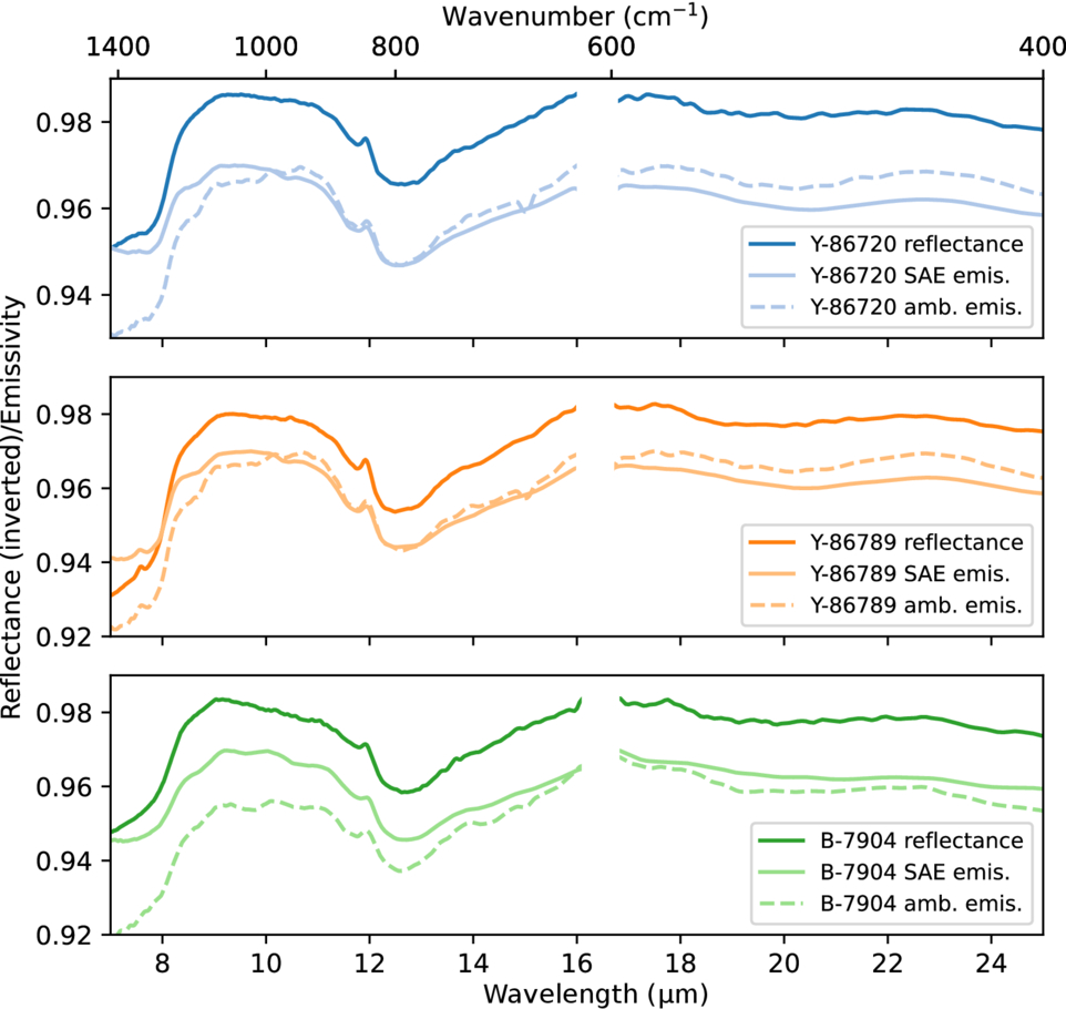 Reflectance spectra of Y-86720, Y-86789, and B-7904. Also included are the SAE and ambient emissivity measurements from H. Bates et al. (2021). Each emissivity spectrum is offset by −0.03. Gaps in the spectra near 16 μm are a region of low signal-to-noise due to low beam splitter throughput.