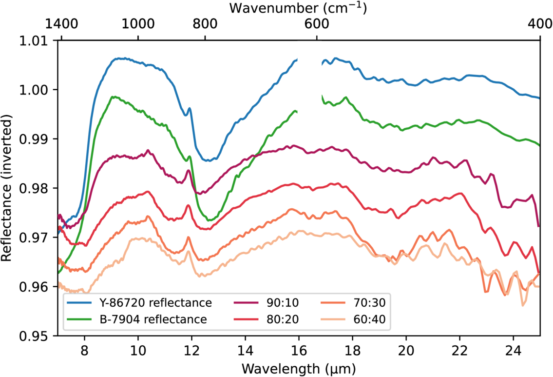 The reflectance spectra of Y-86720 (blue) and B-7904 (green), with the reflectance spectra of olivine/Fe-sulfide mixtures from R. Sultana et al. (2023). Gaps in the meteorite reflectance spectra near 16 μm are a region of low signal-to-noise due to low beam splitter throughput.
