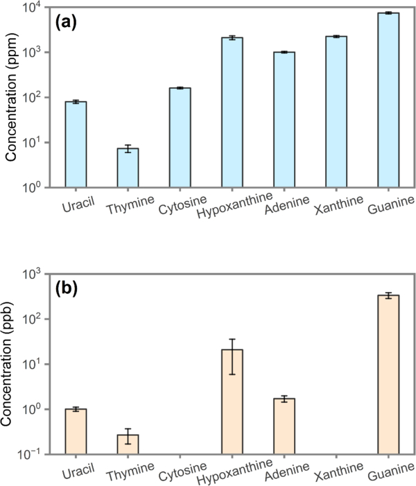 Concentrations of nucleobases detected in (a) the Titan aerosol analog and (b) the Martian analog sample, arranged in order of chromatographic retention time.