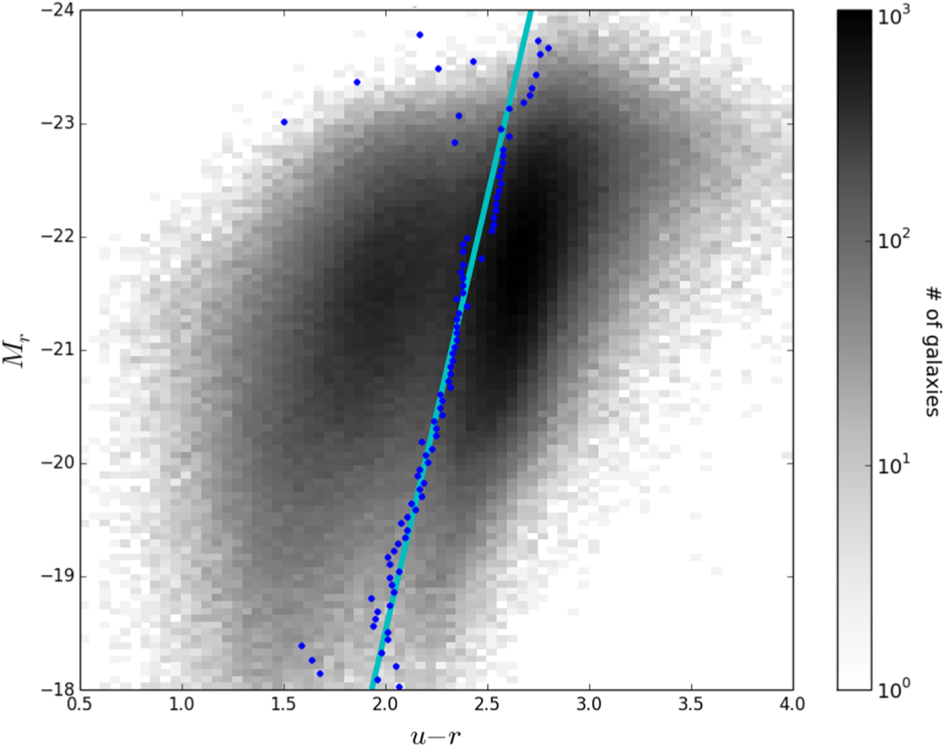 Color–magnitude diagram (u − r vs. M r ) for the SDSS galaxy sample. Blue dots are the optimal 〈u − r〉 for each absolute magnitude bin. Cyan line is the linear color divider.