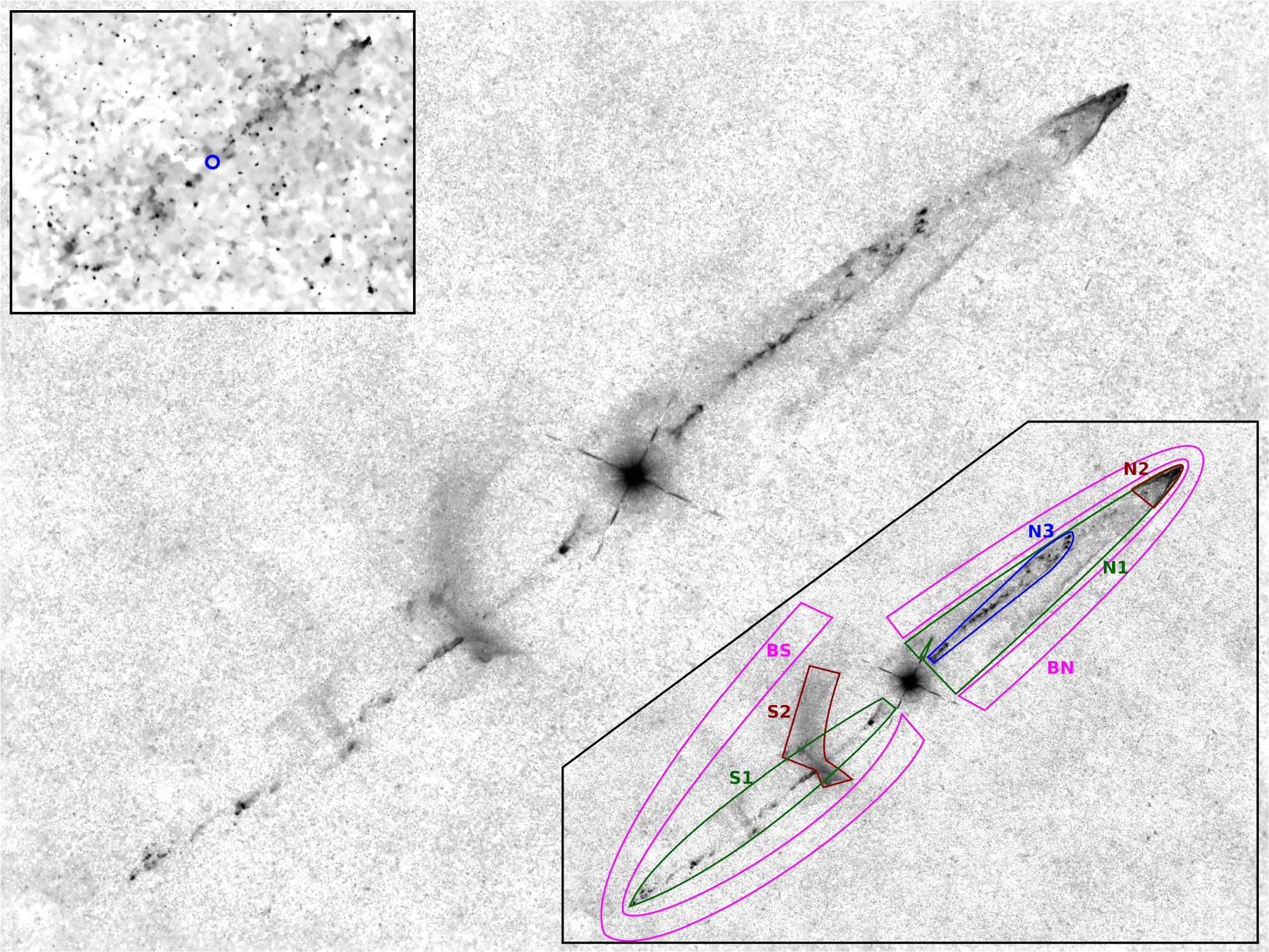 Bipolar jets ejected from KX And in Hα light without continuum. The upper left inset was calculated from the Hα data of DR0.1 of the Northern Sky Narrowband Survey (NSNS), in which the jets were found. In that picture, the jets are close to the detection limit. The main image was captured with a 40 cm instrument and a total exposure time of 16.8 hr. The lower right inset indicates the regions for the intensity measurements in Section 2.2. See Appendix for detailed image data. The high-resolution main image reveals fine details and shows two jets with an apparent length of about 20′, with the northern jet ending in a bright tip. This structure appears to be the outer end of a cigar-shaped shell, likely formed by the interaction of the ejected gas with interstellar matter. There is a diffuse structure in the southern jet, about 7′ from KX And, denoted as “S2” in the lower left inset. Both jets begin (becoming visible) at an apparent distance of about ﹩1\mathop{.}\limits^{{\prime} }8﹩ and the turbulent structure of the jets indicates a varying ejection rate. The bright point source in the main picture is KX And, which remains visible as a result of precise continuum subtraction because the brighter companion of this binary system is an emission-line star (see Section 2.1 for details). In contrast, in the upper left inset, KX And (marked by a blue circle) is eliminated due to inaccurate continuum subtraction with star extraction from Hα data (since it has the highest resolution in DR0.1 of the NSNS, see the section “Data acquisition and processing” in S. Ziegenbalg 2024).