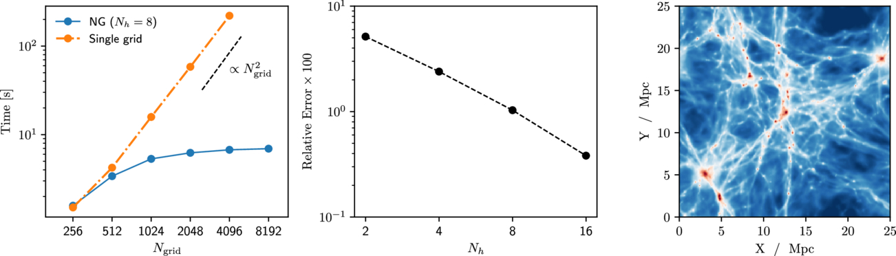 The left panel shows the time required to produce the image displayed on the right as a function of grid size, Ngrid, comparing a single grid approach (dot-dashed line) with the proposed nested grids method (solid line), with Nh = 8. The single grid method scales as ﹩{N}_{{\rm{grid}}}^{2}﹩, as expected (dashed line); the nested grids method, on the other hand, depends weakly on Ngrid for large numbers of cells. The middle panel shows the typical error of the recovered projected density relative to the single grid method as a function of the assumed Nh, for Ngrid = 4096. For Nh = 8, the relative (σ) error is ≈1%, while achieving a speed-up of ≈30.