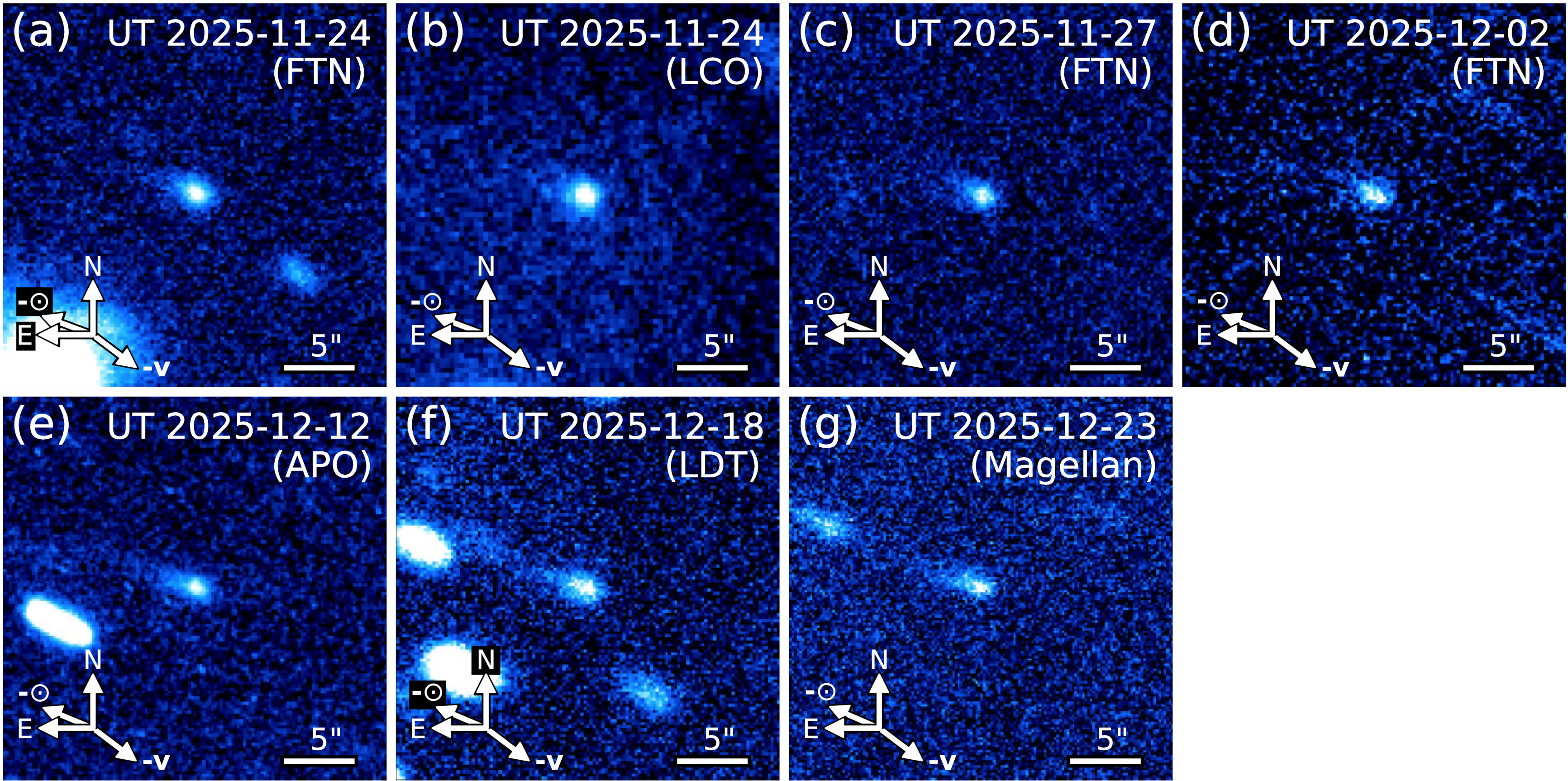 Composite images of 2025 VZ8 (centered in each panel) obtained between UT 2025 November 24 and UT 2025 December 23. North (N), East (E), and the antisolar (−⊙) and negative heliocentric velocity (−v) directions are labeled.
