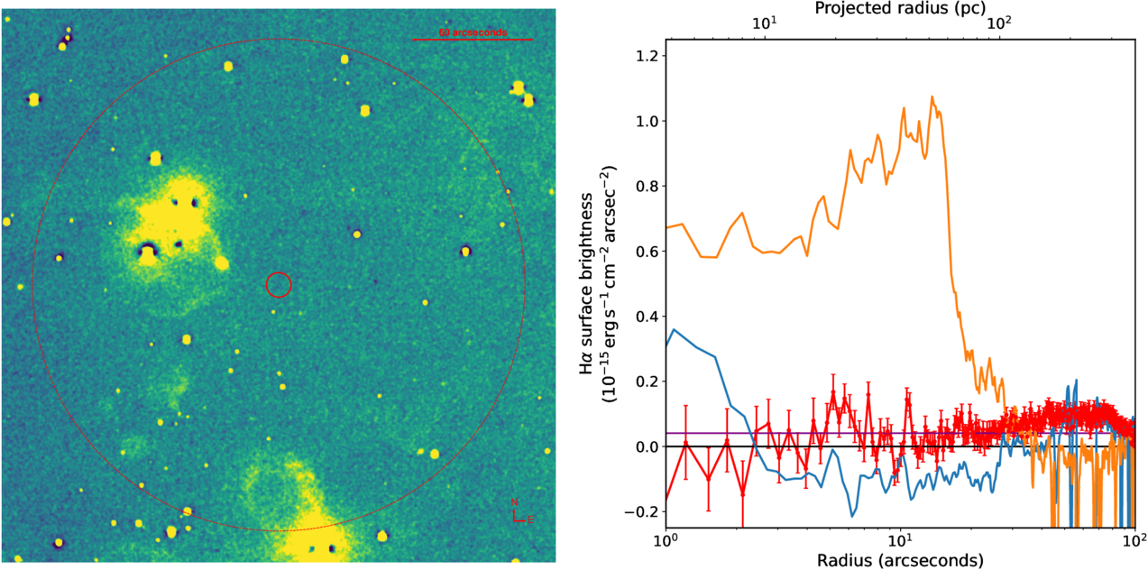 Left: Liverpool Telescope Hα continuum subtracted image showing the extended region around M31N 2017-01e. The image is approximately ﹩{5}^{{\prime} }\times {5}^{{\prime} }﹩. The position of M31N 2017-01e is indicated by the small red circle at the center. The larger dashed red circle indicates the outer extent of the region over which the radial flux profile was computed. Right: the Hα radial flux profile around M31N 2017-01e (red line; this work), compared to the previous measurement (blue line; M. W. Healy-Kalesh et al. 2024b), the radial profile of the M31N 2008-12a nova super-remnant (orange line; M. W. Healy-Kalesh et al. 2024b), and the peak Hα surface brightnesses of the LMCN 1971-08a and KT Eri NSRs (purple line; the black horizontal line just below indicates zero excess flux).