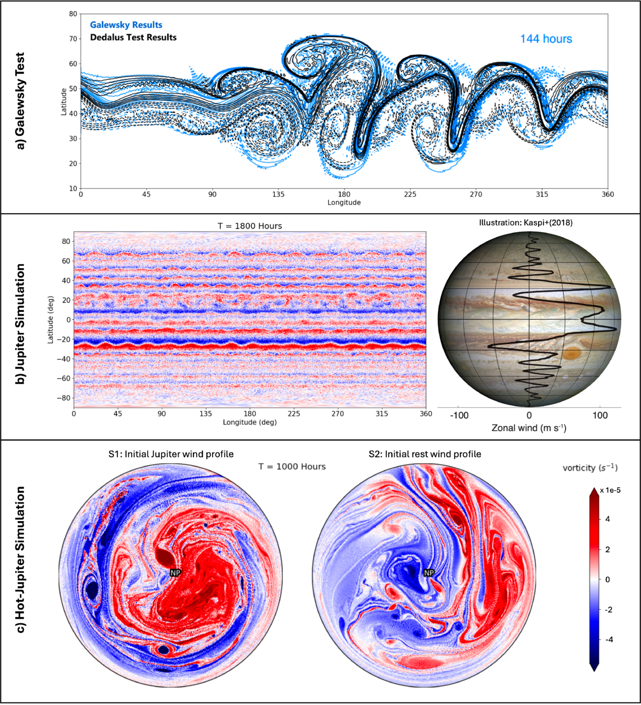 Vorticity fields from T341 simulations. (a) DEDALUS and G04 with ν = 0 showing 2e-5 s−1 contour intervals; calculations match closely but not exactly. (b) Jupiter simulation with DEDALUS (left) initialized with the JWST zonal wind profile (right); jets and banding are stable on the large-scale. (c) Polar view of hot-Jupiter simulations with DEDALUS (at ∼40 “thermal” relaxation times), initialized with Jupiter’s zonal jets (left; S1) and rest (right; S2); the flows showcase the dependence on initial conditions and validate high-resolution simulations.