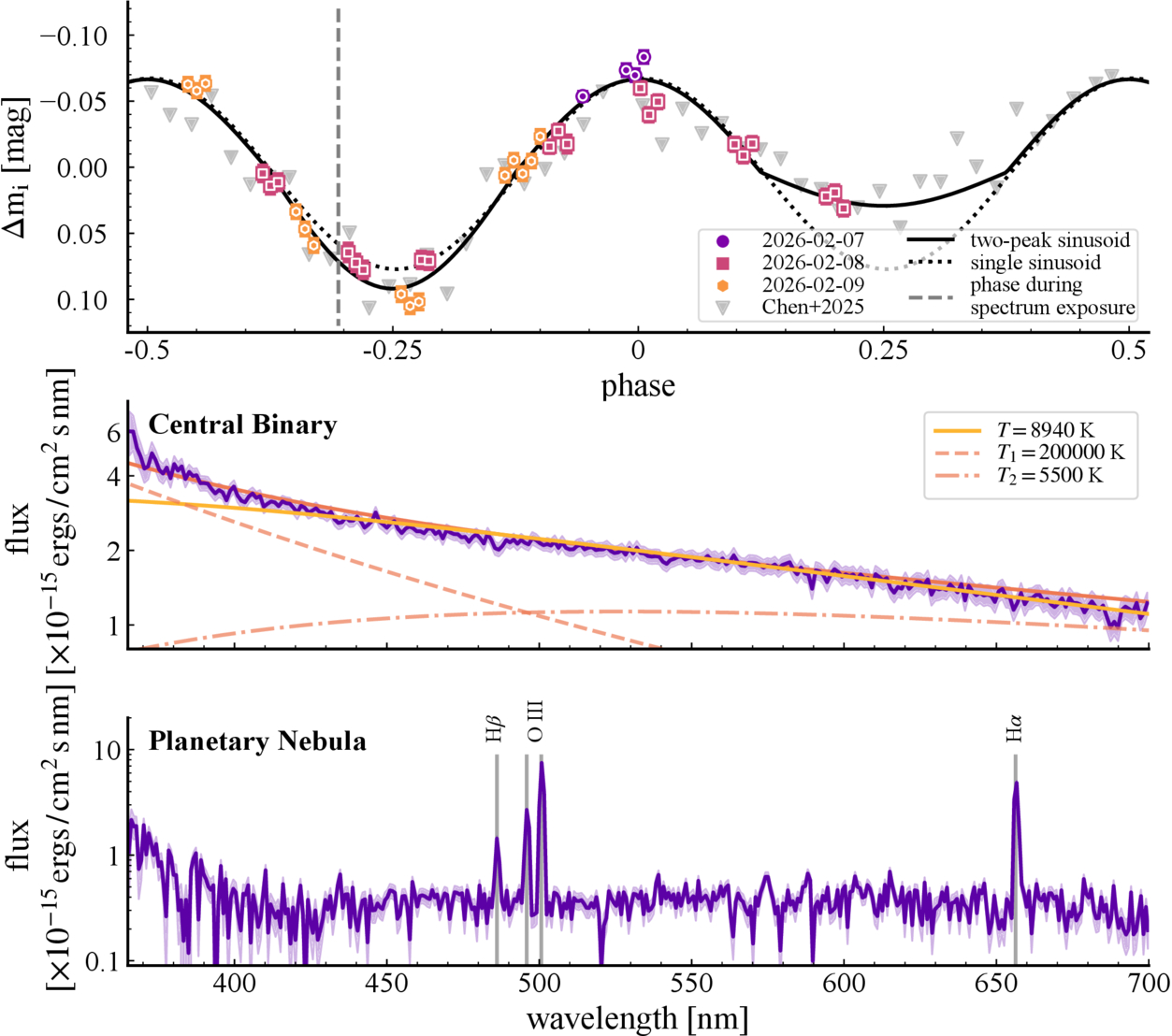 top: phase folded light curve of MPA J0705-1224. Observation nights are indicated by different markers and colors; the vertical dashed line marks the phase during the spectrum shown in the panels below. middle: spectrum of the binary (purple), fit with a single (yellow) and a double (orange) blackbody model, the two individual blackbody contributions to the double blackbody model are shown by the dashed and dashed–dotted lines. bottom: planetary nebula spectrum (purple), Hα, Hβ and the O III doublet emission lines are indicated.