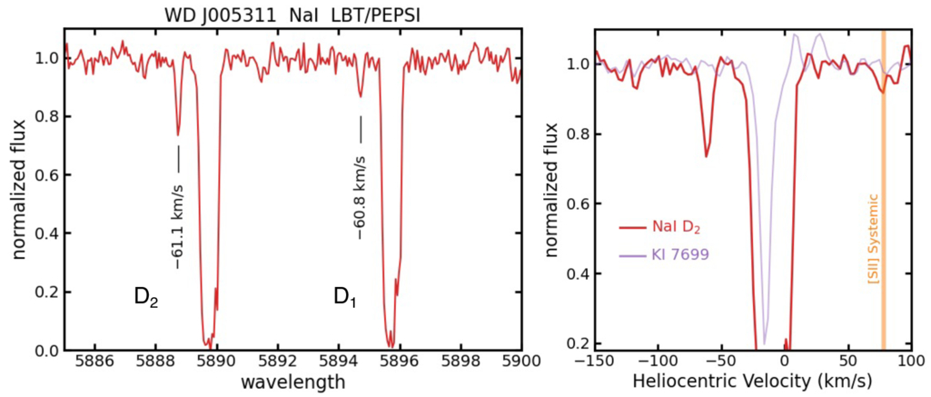 Left: high resolution spectrum of J0053, the star at the center of the SN 1181 remnant. Saturated interstellar absorption lines of Na I are consistent with the significant dust extinction in the direction of J0053. High-velocity Na I absorption is detected at −61.0 ± 0.2 km s−1 in both Na I components. Right: close-up of the D2 component (solid red line) plotted versus heliocentric velocity. The K I absorption feature is shown as a light purple line. The high-velocity component is below the K I detection limit. The solid orange band indicates the systemic velocity of the nebula’s [S II] emission assuming that it is expanding symmetrically.