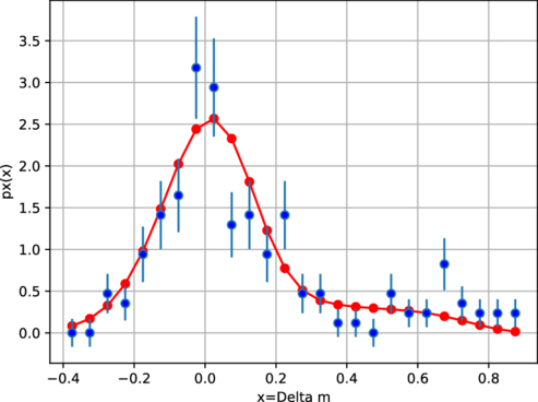 The empirical probability density function p x (x) for the solar-type part of the MS for M67 (blue data points). The red curve with solid red guide points gives a fit of a model probability density function p x (x) to the measured function for M67. The model incorporates a Gaussian width σ = 0.117 and a binary fraction A = 0.353.