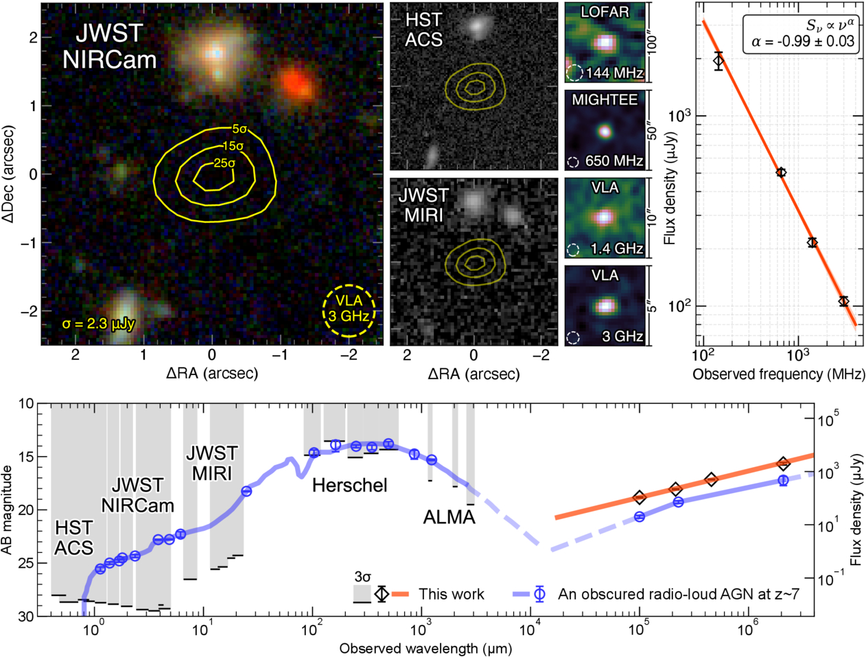 Multi-wavelength observations of the JWST-dark radio source. Top Left: JWST NIRCam color image (blue: F090W+F115W+F150W; green: F200W+F277W; red: F356W+F410M+F444W) with VLA 3 GHz contours overlaid at 5σ, 15σ, 25σ in yellow, where σ = 2.3 μJy beam−1. Top Middle: the stacked HST ACS (F475W+F606W+F814W) image, JWST MIRI image (F770W+F1280W+F1500W+F1800W+F2100W), and radio imaging data from 144 MHz to 3 GHz with dashed circles indicating the corresponding beam size. Top Right: radio spectral fit, yielding α = −0.99 ± 0.03 for Sν ∝ να. Bottom: photometric measurements and spectral energy distribution. Gray shadows show the 3σ upper limits from HST, JWST, Herschel, and ALMA, together with the radio detections denoted by black diamonds. Blue circles and lines represent a model SED of a heavily obscured radio-loud AGN (R. Endsley et al. 2023) at z ∼ 7 for comparison.