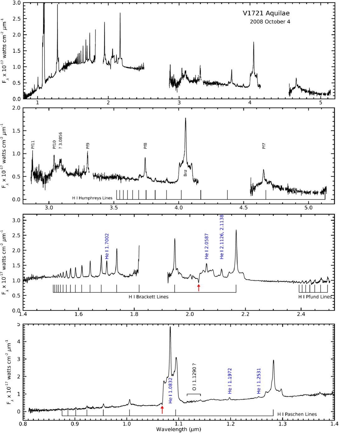 Infrared spectrum of the nova V1721 Aquilae from 12 days after discovery. The top panel shows the entire spectrum and highlights the steep decline to the blue caused by the very high Galactic reddening. The numerous H I lines from the various series are generally identified with tick marks although, in the second panel down the Pfund series members and Brα are labeled directly in order to avoid confusion with the Humphreys series. He I lines, present in the lower two panels, are labeled in blue. Identification of the broad, low-contrast emission feature in the bottom panel with O I 1.1290 μm is based upon detection of its companion feature 0.8446 μm in the early spectra of L. A. Helton et al. (2008) and R. Hounsell et al. (2011). The unidentified feature in the second panel down is labeled with our best determined laboratory wavelength. The red arrows in the bottom two panels mark the only P-Cygni absorptions that we detected. They are on the broad components of He I 1.0832 and 2.0587 μm. Both of these helium lines have metastable lower levels that are significantly populated, resulting in sufficient optical depth to produce absorption features. None of the other lines in our spectral range, either broad or narrow, do so. The small, double-peaked feature at 2.0 μm is telluric in origin.