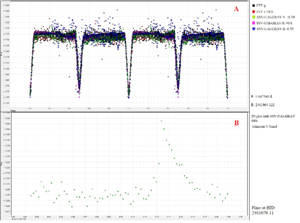 (A): SSV-UAI-GRAV_V4 phase plot, (B): flare with SSV-UAI-GRAV data in V, R, B band and ZTF data.